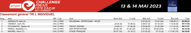 Prvi je na podijumu bio Bart Aernouts (04:06:24), a za njim je na cilj stigao Cyril Viennot (04:11:04) Lider u plivanju, Stojanović se dobro zadržao na trećem mestu. Keinle se našao na četvrtom mestu, nešto više od šest minuta zaostatka za pobednikom.