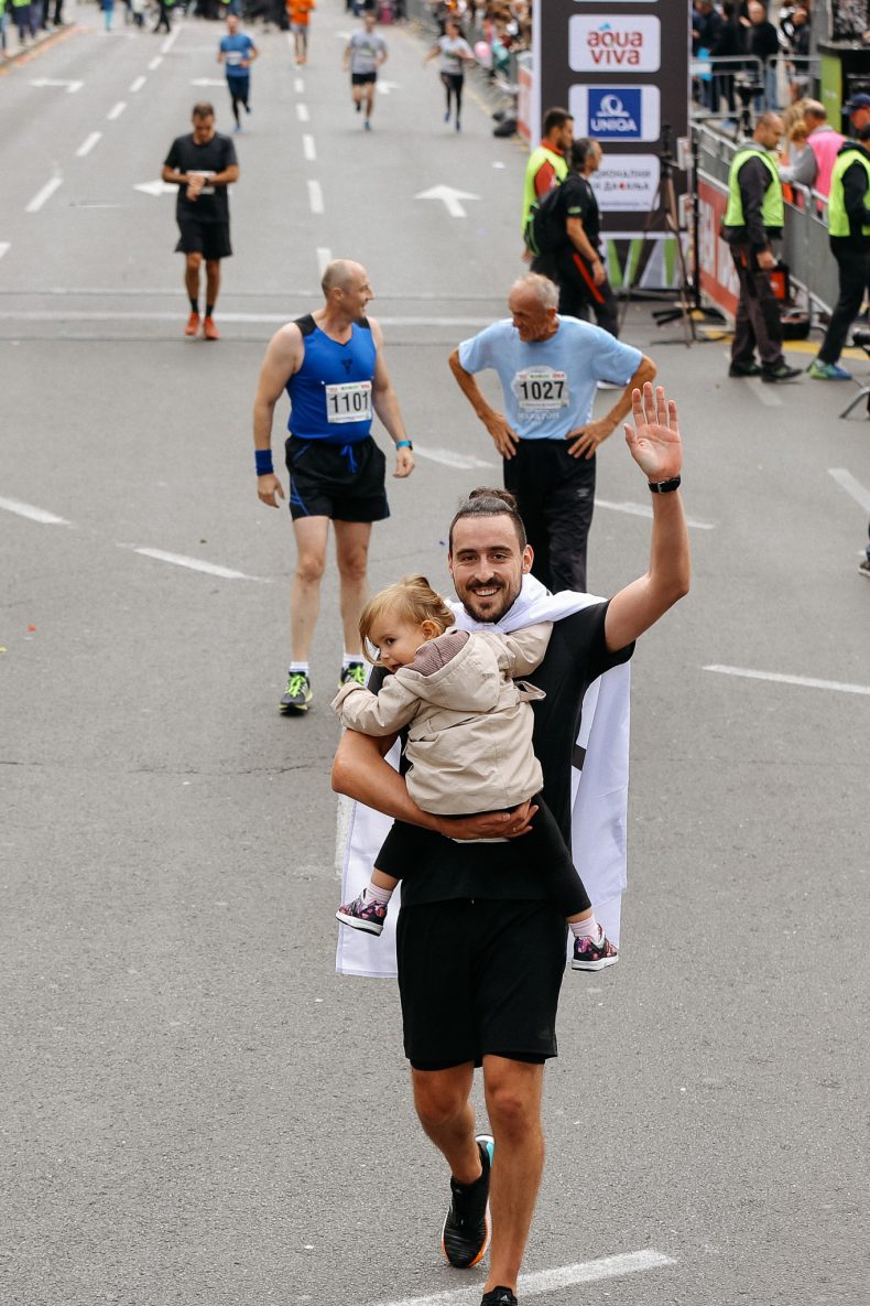 Marko Tomić se već godinama profesionalno bavi trčanjem i redovan je na Beogradskom polumaratonu, ali ove godine na cilj nije stigao sam. Na 100 metara pred kraj trke čekala ga je supruga sa dvogodišnjom ćerkom Vanjom koju je Marko uzeo i zajedno sa njom prošao kroz cilj.