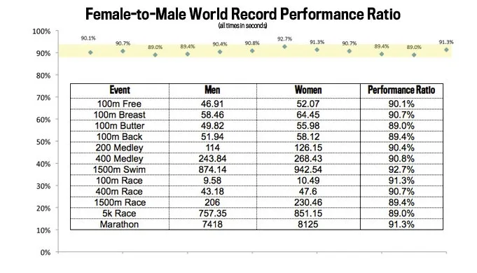 Zanimljivo je da se ova cifra od 0.88 vidi i u osnovnih fiziološkim razlikama polova. Muškarci su imali za oko 12% više hemoglobina u krvi i 12% veći VO2 max. Žene su na 88% muške vrednosti.
