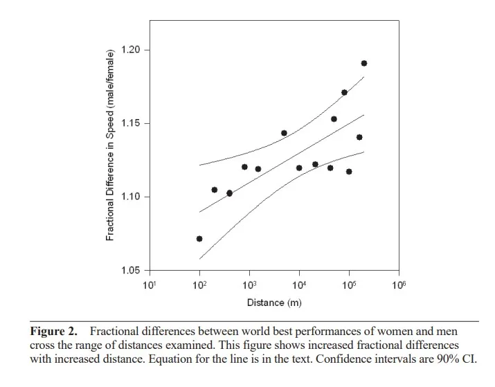 Ustanovili su da je prosečna razlika u brzini 12% a da su najveća odstupanja an 100m i 42km (žene su tu najsličnije). Iz nekog razloga, anomalnijska razlika na dužini od 100km (iako uključena u analizu) nije bila istaknuta u studiji, kao značajno odstupanje.