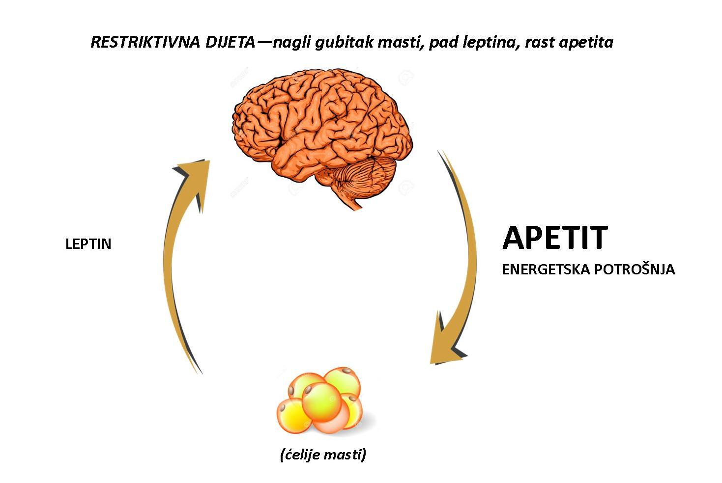 E, onda se desi nešto novo (kreće naravno iz naše glave, kao i svi drugi problemi). Uvuku nam se neke buve kako pod hiiitno moramo da smršamo, obavezno što više i za što kraće vreme (juče, ako je moguće) i tako pokušavamo “veštački” da smanjimo ovaj apetit. Prvi odgovor našeg tela je logičan – počinje da se troši, odnosno smanjuje masti. Manja količina masti luči i manje leptina.
