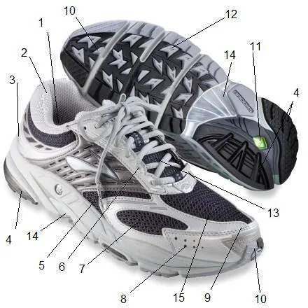 - Prednje ojačanje – daje bolju potporu prstima, a u zavisnosti od namene, može da bude manje ili veće. Kod maratonskih patika je manje, kod trail patika je veće. Na ovom modelu viditte i rupe za ventilaciju – one postoje kod modela sa mrežom, ali i kod patika bez mreže, obično su na prednjem ojačanju ili gornjem sloju (15) za nepovoljnije vremenske uslove. Ovaj element donekle omogućava nozi da diše, ali ne značajno kao mreža.